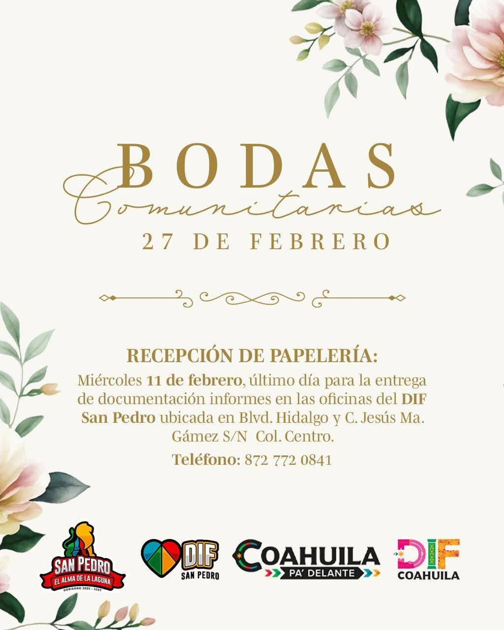 La gran ceremonia colectiva se llevarรก a cabo el 27 de febrero de 2026. Las parejas interesadas tienen como fecha lรญmite el 11 de febrero para entregar su documentaciรณn en las oficinas del DIF Municipal (Bulevar Hidalgo y calle Jesรบs Marรญa Gรกmez S/N).