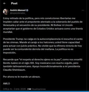 Tras las declaraciones de la presidenta de Mรฉxico, Claudia Sheinbaum, sobre su rechazรณ al intervencionismo de los Estados Unidos en un territorio soberano, el expresidente, Andrรฉs Manuel Lรณpez Obrador, saliรณ de su retiro para dar sus declaraciones en una publicaciรณn de redes sociales.
