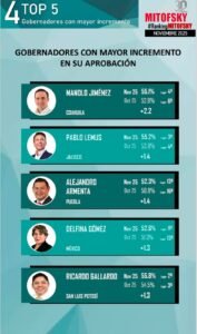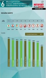 En la consulta Mitofsky, el Mandatario coahuilense aparece en la cuarta posiciรณn entre las y los gobernadores mejor evaluados yย el primero de la regiรณn Norte, ademรกs de ocupar elย primer lugar entre los de mayor incremento en su aprobaciรณn.