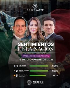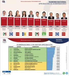 Saltillo, Coahuila.- El gobernador de Coahuila, Manolo Jimรฉnez Salinas, cierra 2025 como uno de los mejor evaluados entre los gobernadores y gobernadoras del paรญs, segรบn los rรกnkings publicados por diversas casas encuestadoras nacionales.