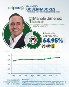 Saltillo, Coahuila.- El gobernador de Coahuila, Manolo Jimรฉnez Salinas, cierra 2025 como uno de los mejor evaluados entre los gobernadores y gobernadoras del paรญs, segรบn los rรกnkings publicados por diversas casas encuestadoras nacionales.