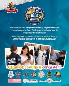 SAN PEDRO, Coahuila.- Con el objetivo de reforzar la seguridad y mantener una cercanía permanente con la comunidad, la alcaldesa Brenda Cecilia Güereca Hernández puso en marcha el operativo 10 de 10 en coordinación con el Gobierno Federal y el Gobierno del Estado.